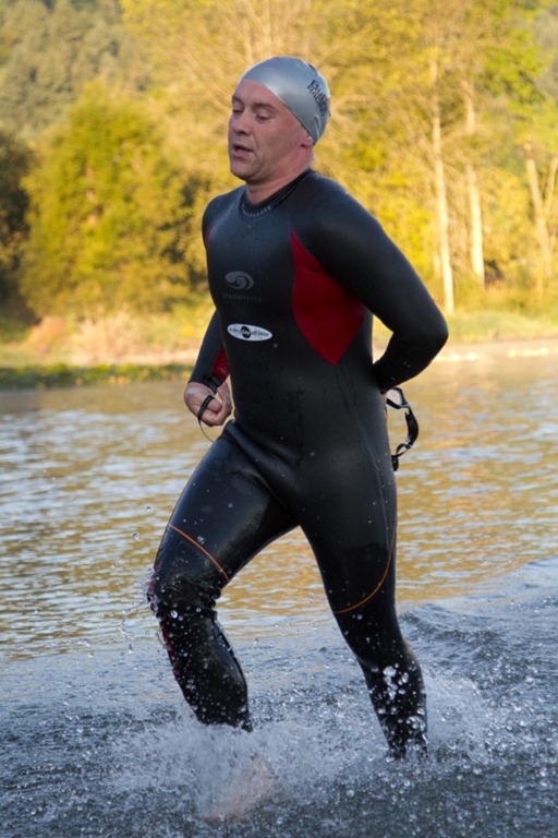 345 AM – what is going on, who is calling middle of the night, can somebody please answer that phone and turn off that sound … after a good oatmeal with bananas breakfast I packed the last things into the car and out Alan’s and my bike on the bike rack. Alan dropped by yesterday to drop of his gear so we could get a good start in the morning. We got up to Monroe at 530, right when registration and transition opened and it was totally dark but we could see that the lake was covered in a thick fog. Race was delayed 15 minutes to let the fog clear and when wave 1 started Alan and I together with another 25 guys supposed to start in Wave 2 were left on the beach as all men apparently started at the same time …